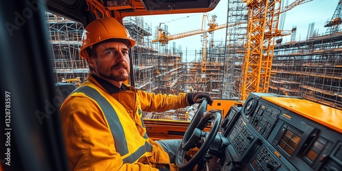 Construction worker operates a massive tower crane from its high cockpit, wearing a safety helmet and vest. He carefully maneuvers the controls, lifting heavy materials with precision