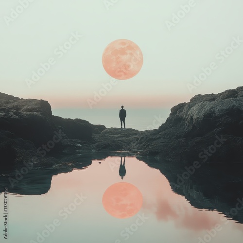 Solitary Figure Contemplating a Pink Moon's Reflection Over Still Waters