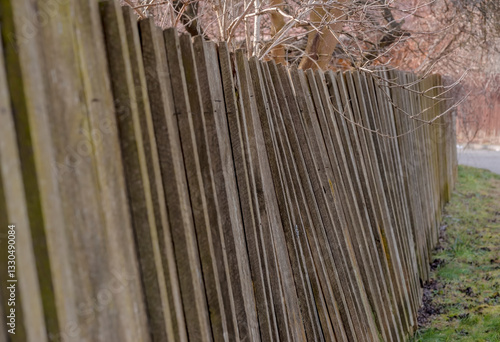 Bardzo stary drewniany płot, osłabiony przez czas i naturę. Spróchniały płot z pionowymi deskami, lekko pochylony. Drewno wygląda na stare, z widocznymi oznakami rozkładu i plamami zielonego mchu.