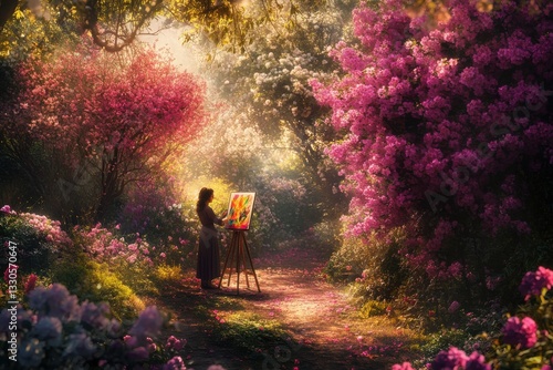 A woman engrossed in painting at an easel in a sunlit garden, serenity.