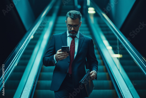 Geschäftsmann nutzt Smartphone während er die Rolltreppe hinuntergeht