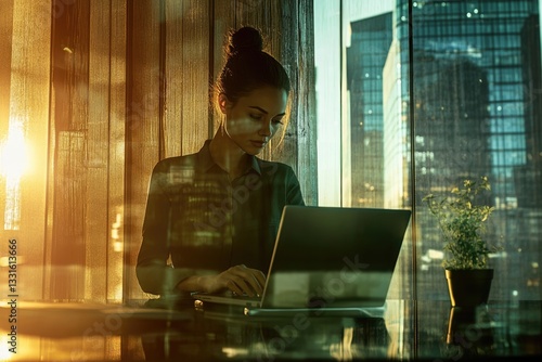 A young businesswoman works on her laptop in a modern office with a city view during sunset.