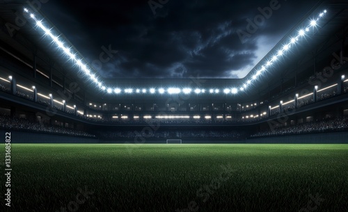 Illuminated Football Stadium at Night with Empty Green Grass Field