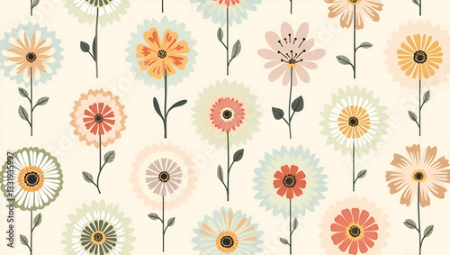#1572847140Vibrant Retro Floral Meadow with Stylized Teal and Orange Daisies.