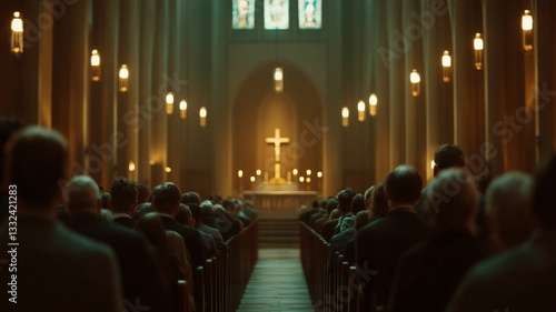 Blurred background of inside Catholic Church full of devotees, religion concept