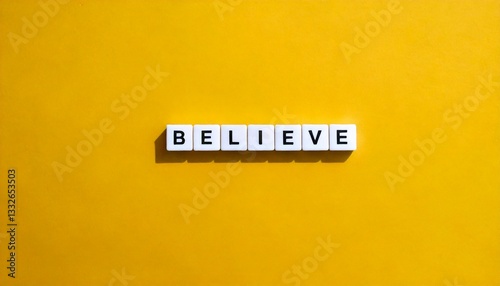 Believe word banner letter tiles on yellow background isolated modern simple aesthetics