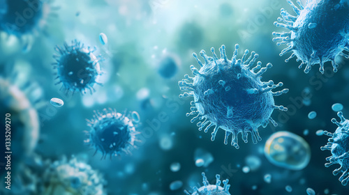 Swarms of blue bacterial cells suspended in air, dust, blue bacteria. Spore Clouds. Illustration