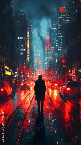 City Silhouette: A lone figure stands on a rain-slicked city street at night, surrounded by towering buildings and the neon glow of urban life. Capturing the atmospheric essence of city life.