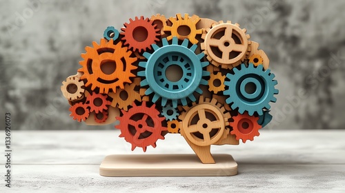 Human brain with colorful wooden gears connected in a dynamic flow, representing neurodiversity, individuality, and innovative problemsolving, vivid design, ultrasharp, 4K