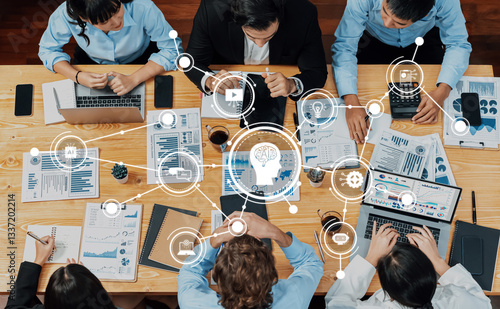 A diverse team collaborates at a modern workspace, surrounded by charts and devices, symbolizing connectivity and the integration of technology into business strategies. Amity