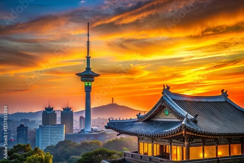 Silhouette of Korean Landmarks at Sunset - Flat Line Design Stock Photo