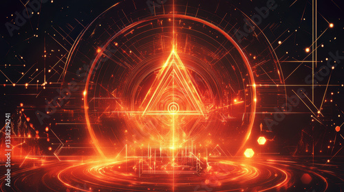 glowing geometric design with central triangle radiates vibrant orange light, creating mystical and futuristic atmosphere. intricate patterns suggest blend of technology and mysticism