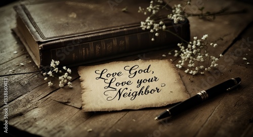 Handwritten text verse on vintage paper stating "Love God, love your neighbor," alongside a closed book and pen on a wooden table. Concept of faith and obedience to the greatest commandment.