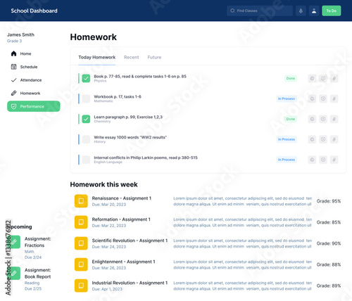 School Dashboard, Education Portal, Homework Web App Calendar Academic CMS Classroom UI Kit Template