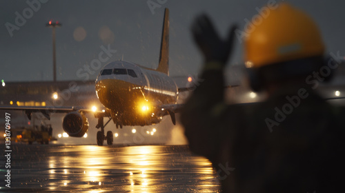 Ground staff coordinating aircraft taxi with hand signals during rainy weather at airport, showcasing teamwork and precision in aviation operations