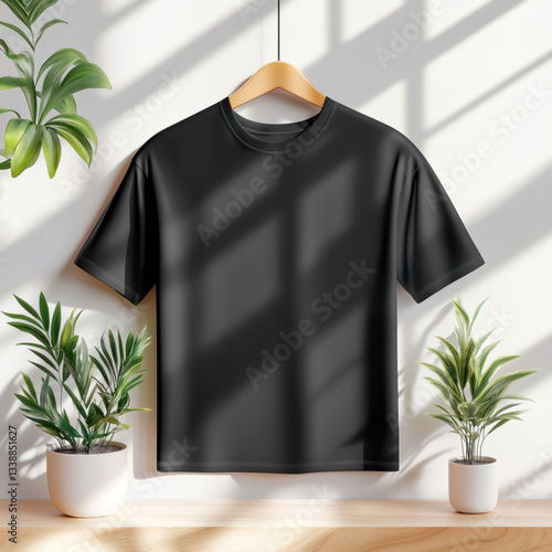 Hanging black tshirt mockup. Plain unisex shirt with white background, studio shot. Short sleeve t-shirt on hanger mock up. Gender neutral black tee. Casual crewneck blank shirt template mock