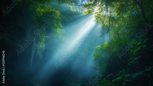 A beam of morning light pierces through the ravine, illuminating the misty air and creating a dramatic