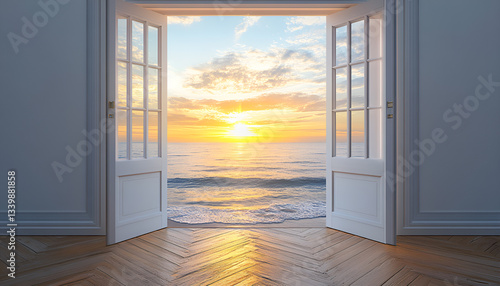 Doorway to a beautiful sea. Concept of calmness, dreams, relaxation, freedom, adventure, journey, new beginnings, the unknown, mystery exploration and limitless possibilities