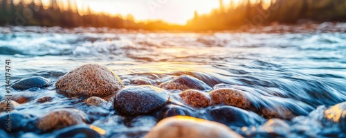 River rapids landscapes twilight concept. A tranquil river scene at sunset, with smooth stones partially submerged in water.