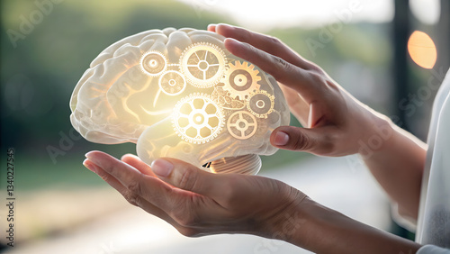 mental health awareness at work and cognitive function concept. close up of hands holding a glowing brain with gear