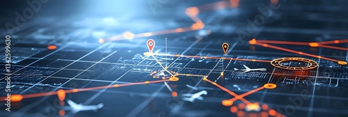 Futuristic abstract visualization of a digital navigation grid displaying dynamic flight paths and airport waypoints representing a complex transportation and logistics network