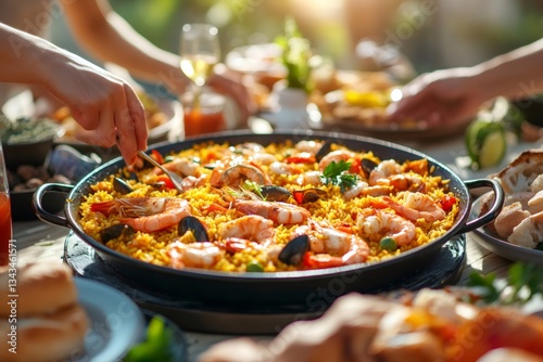 Friends eating traditional spanish paella outdoors at sunset party