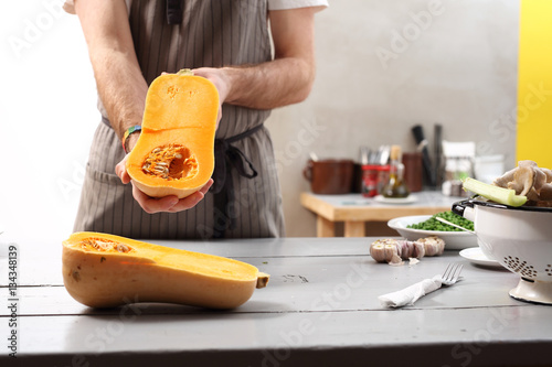 Potrawy z dyni. Kucharz trzyma w dłoni dojrzałą dynię piżmową.