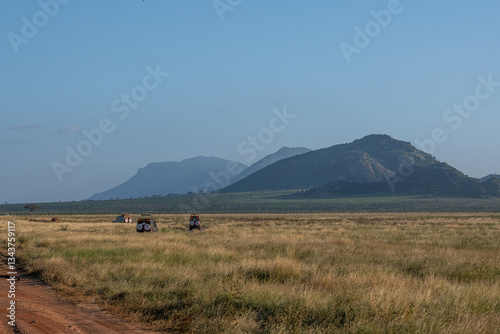 samochody z turystami na safari, Czerwona droga biegnąca przez sawannę w Park Narodowy Tsavo i rezerwat wzgórz Taita, Kenia, Afryka