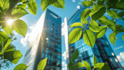 A modern business district rises into a vibrant blue sky, framed by lush, green leaves in the foreground.