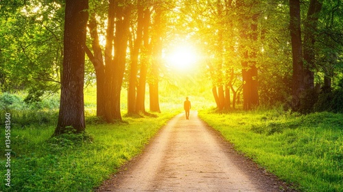 Person walking on a sunlit path through a lush green forest.
