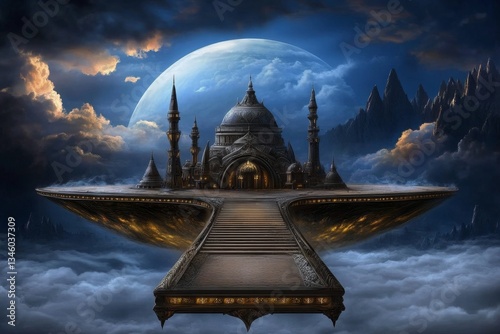 A fantasy steampunk world map, featuring floating islands connected by steam-powered bridges, flying airships, and mysterious ancient ruins