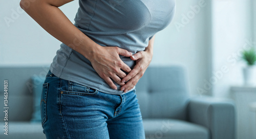 Abdominal pain discomfort at home, Woman holding stomach experiencing cramps, Healthcare and digestive issues concept, Female in casual wear showing signs of menstrual pain
