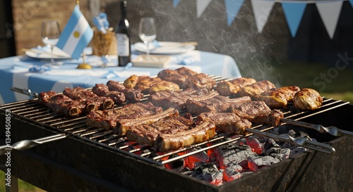 #239955852Grilled Skewers of Meats and Vegetables on Brazilian Barbecue with Fresh Ingredients in Background and Copy Space for Text