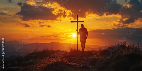 Sunset silhouettes people standing by a cross on a hilltop with stunning orange and yellow sky