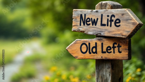 wooden sign post with "New Life" and "Old Left" arrows, idyllic nature background
