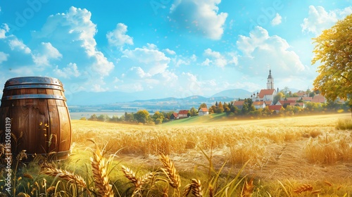 Traditional Oktoberfest greeting card featuring a scenic Bavarian village wooden barrels of beer and golden wheat fields under a bright blue sky One side remains empty for writing personal notes