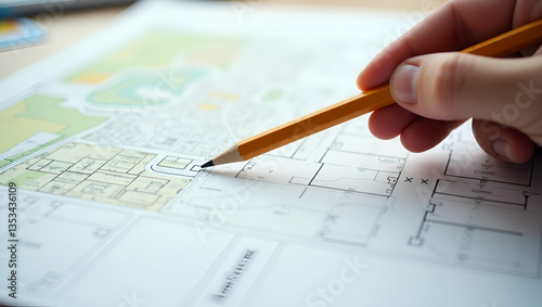 Hand holds pencil pointing to cadastral map for choosing and buying a plot for house construction planning. concept as Depicts real estate decision making emphasizing property selection strategic plan