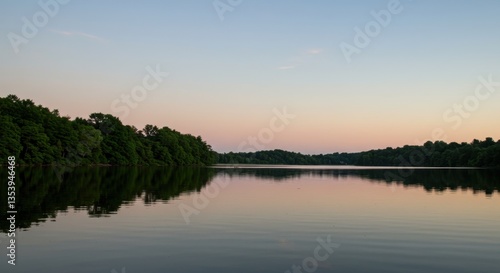 Serene Sunset Reflected on a Tranquil Lake Surrounded by Lush Greenery in a Peaceful Setting
