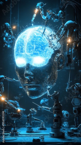 A large glowing AI head suspended in a dark futuristic setting, surrounded by robotic arms and intricate machinery, symbolizing cutting-edge technology and AI advancements.. AI Generation. AI