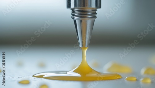 Close-up view of the nozzle of a tube of glue for general use, featuring the dripping and pooling of product on the surface.