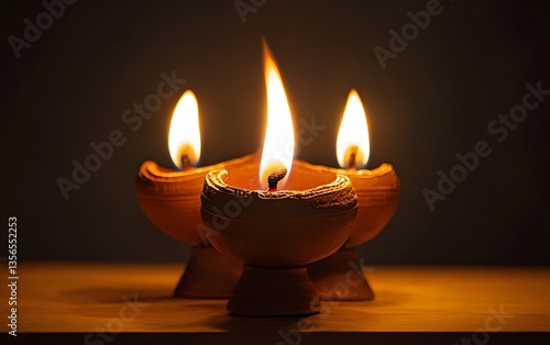 Three Illuminated Clay Oil Lamps Glowing in Dark