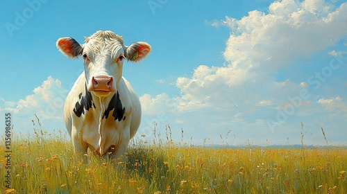Profile of a Holstein cow with a full udder, chewing cud calmly, lush summer grass and open blue sky creating a clean and serene composition.