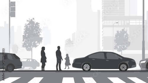 The image is a grayscale illustration depicting a city street scene. The scene is composed primarily of simplified silhouettes of people, cars, and buildings. The silhouettes are rendered in