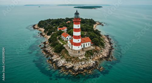 Lighthouse Aerial View Red White Stripped Roof Ocean Island Rocks