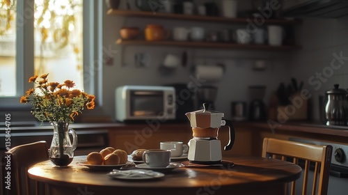 Moka pot coffee maker brewing espresso in a kitchen, with a wooden table set for a coffee break.