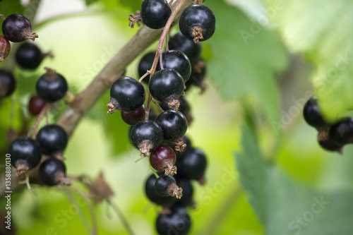 Blackcurrant berries growing on branch in summer sunlight