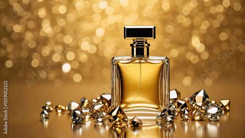 Elegant perfume bottle with golden liquid, adorned by sparkling diamonds against a bokeh golden backdrop. Luxurious and glamorous still life composition.