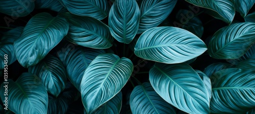 Close up dark green tropical leaves texture background, abstract blue nature wallpaper.