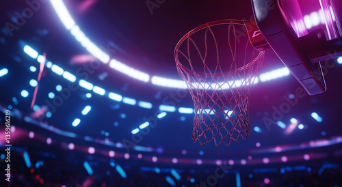Close up de uma bola de basquete passando pela cesta durante um jogo profissional dentro de um estádio lotado, com luzes brilhantes iluminando a cena