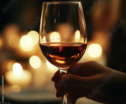 A person is holding a wine glass with a full glass of wine in it. The image has a warm and cozy atmosphere, with candles in the background